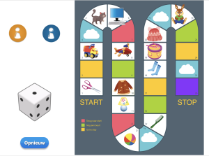 Klik op de dobbelsteen. Sleep de pion naar het juiste vakje. De gekleurde vakjes hebben een instructie die linksonder staat vermeld voor de logopedist.