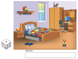 In de slaapkamer zijn verschillende objecten zichtbaar. Door op de dobbelsteen te klikken veranderen de objecten in de kamer. Het aantal dat je gooit is gekoppeld aan een opdracht die de logopedist bedenkt.